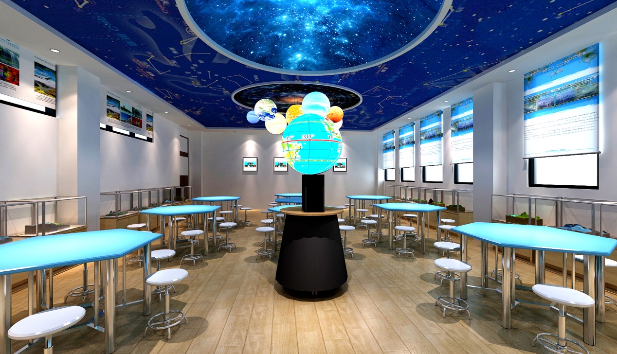 該教室占地102.25平方米,風(fēng)格上依然延續(xù)藍(lán)白風(fēng),設(shè)計(jì)簡約又充滿科技感。與以往專用地理教室相比,教室吊頂層不僅有宇宙星空演示用的天文穹頂,還增加了懸掛式立體太陽系星球,在燈光的襯托下仿佛置身于其中,宇宙的無窮奧秘等著你去探索,這種情境式的教學(xué)環(huán)境能夠使學(xué)生快速進(jìn)入學(xué)習(xí)地理的狀態(tài),提高課堂效率。