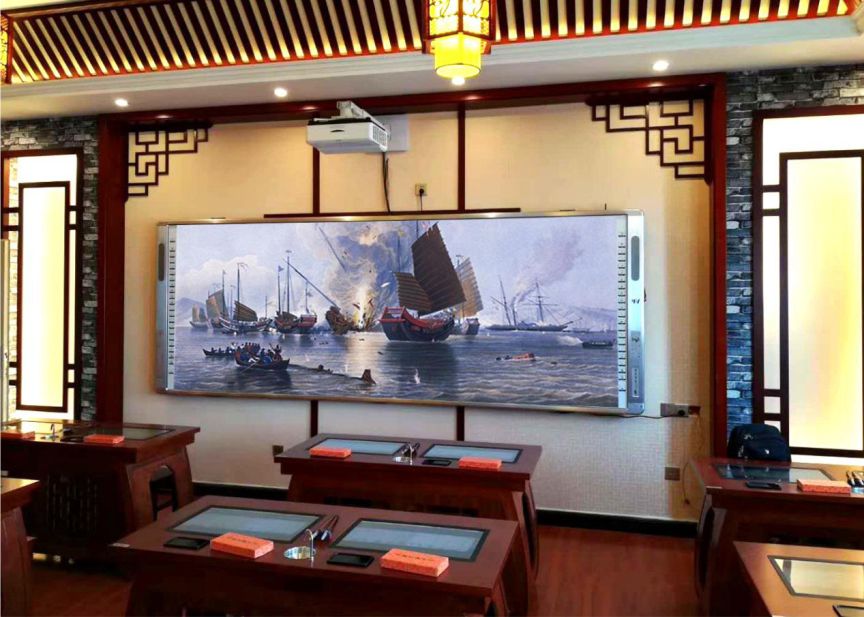 從走進(jìn)教室,博物架、仿古壁紙、古色古香的方格鏤空花雕隨處可見,文房四寶靜置于木質(zhì)長(zhǎng)桌上,長(zhǎng)桌玻璃鏡面內(nèi)置全息書法字庫(kù)、書法課件播放系統(tǒng)、字帖生成系統(tǒng)等,學(xué)生可以直接將宣紙鋪在桌上臨摹,即可練習(xí)書法。環(huán)顧周圍,你會(huì)看到各個(gè)時(shí)期的器物,如周朝的青銅方鼎、春秋時(shí)期的戰(zhàn)車、明清的仿瓷以及很多國(guó)學(xué)大師的經(jīng)典語錄,整間教室都充滿著靜謐,流淌著淡淡墨香。