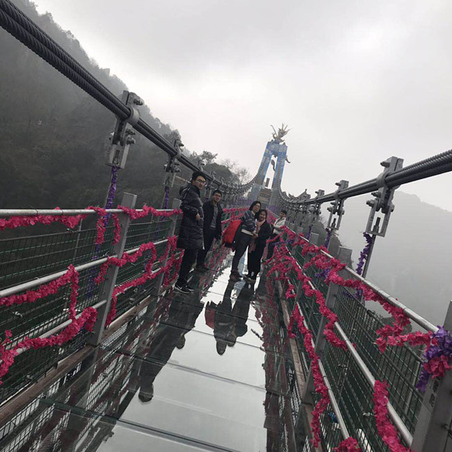 “飛龍玻璃橋”全長388米,垂直高度180米,橫跨馬仁奇峰太陽山與主峰之間,連接天梯玻璃棧道共同組成了一個高空體驗觀景勝地。從遠(yuǎn)處看,兩條巨龍盤踞在玻璃橋兩端,橋下萬株楠木,宛如一幅“飛龍?zhí)鞓蚩撮!钡慕^妙畫卷。