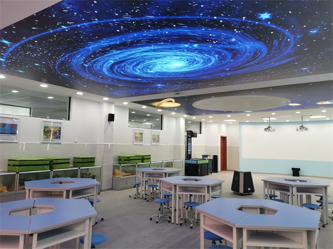 深邃的藍(lán)色、小組學(xué)習(xí)式的課桌椅以及四周的地理知識窗簾和地形地貌模型,羿飛地理專用教室一改傳統(tǒng)教室的設(shè)計(jì)布局,以更清新自由的形象展現(xiàn)在師生面前。