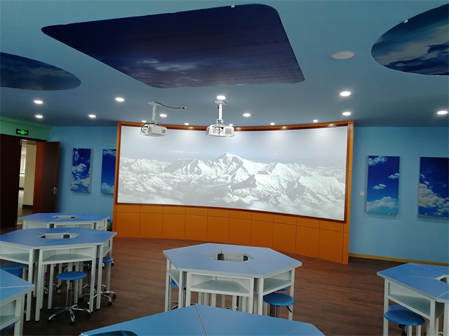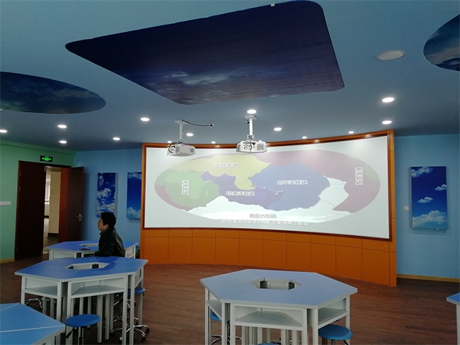 羿飛環(huán)幕示教系統(tǒng)這一超大尺寸曲面投影,專用于各種地理圖片、視頻資料的播放,給學(xué)生開(kāi)啟了一雙“千里之眼”,足不出戶,盡覽天下事。