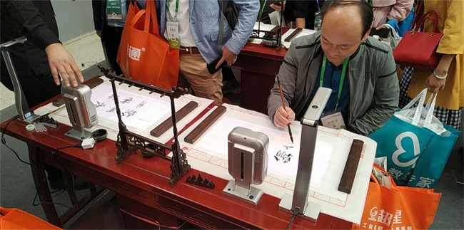 在展會(huì)現(xiàn)場(chǎng),參觀者在翰墨派書法教學(xué)系統(tǒng)的指導(dǎo)下完成一幅書法寫作,還能領(lǐng)取一份精美禮品,大家躍躍欲試,活動(dòng)參與者眾多,親自感受了一把揮毫潑墨的樂趣。