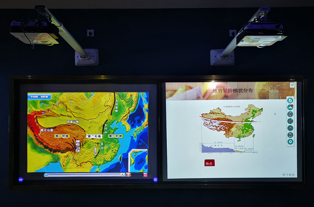 數(shù)字立體地形由立體模型(中國/世界)、推拉白板、投影機(jī)、互動(dòng)模塊、應(yīng)用軟件及演示內(nèi)容構(gòu)成。教師通過手中的控制筆指點(diǎn)擊模型或演示白板上的功能按鈕,即可演示中國地形、河流,降水量、植被、溫度帶、氣候等的文字、圖片、視頻、動(dòng)畫等地理信息,數(shù)字立體地形全方位地將模型的課件內(nèi)容展示給學(xué)生,最大的賦予了模型更豐富的教學(xué)內(nèi)容,更好地詮釋數(shù)字化多媒體地理教學(xué)理念,使在地理教學(xué)應(yīng)用上更加生動(dòng),形象。